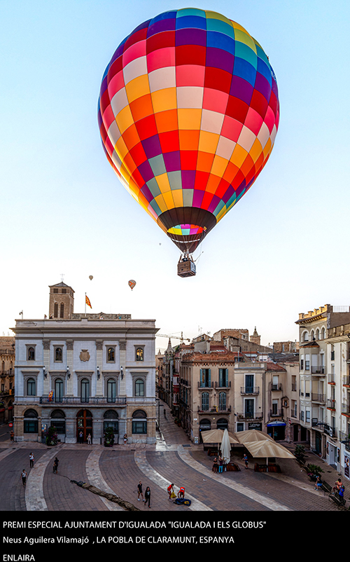 Enguany, als premis s’hi sumaven dues novetats. En primer lloc, el premi especial Ajuntament d’Igualada “Igualada i els globus” que buscava una fotografia que transmetés la relació de la ciutat amb els globus aerostàtics. De les 80 fotografies que optaven a aquesta categoria, el jurat format per les fotògrafes Laia Claramunt, M. Teresa Closas Xifré i Anna Batalla, van atorgar el premi a l’obra “Enlaira” de la fotògrafa de la Pobla de Claramunt, Neus Aguilera Vilamajó. Es va endur 500€ i un trofeu de l’Ajuntament d’Igualada.